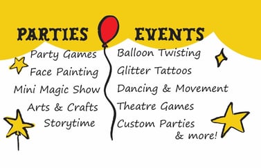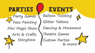 Standard Options Include: Parachute Games, Dancing, Storytime, Mini Magic Show, Theatre Games, Rhythm Games, Party Games, Hot Potato, Musical Chairs, Red Light Green Light, Duck Duck Goose, Statues, Face Painting, Balloons, Glitter Tattoos, Arts & Crafts*